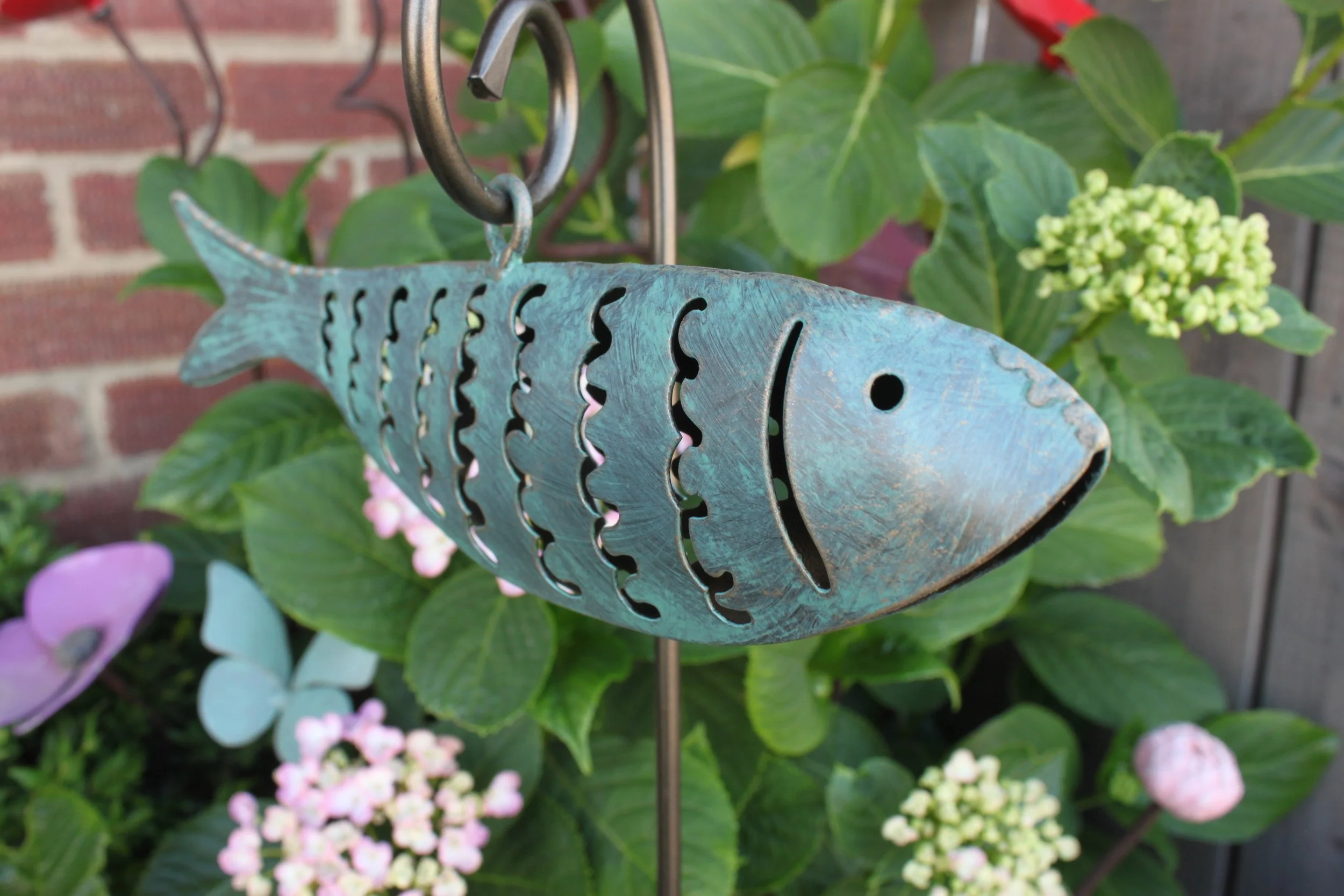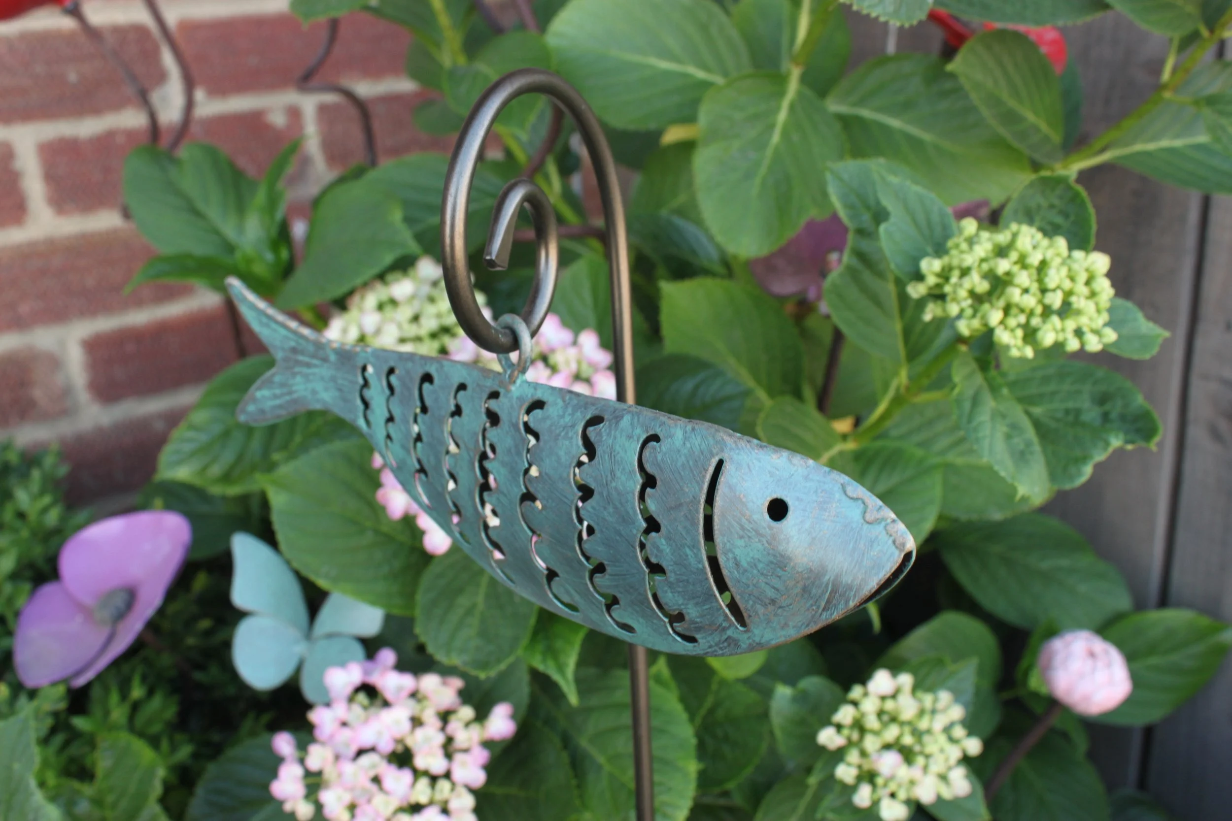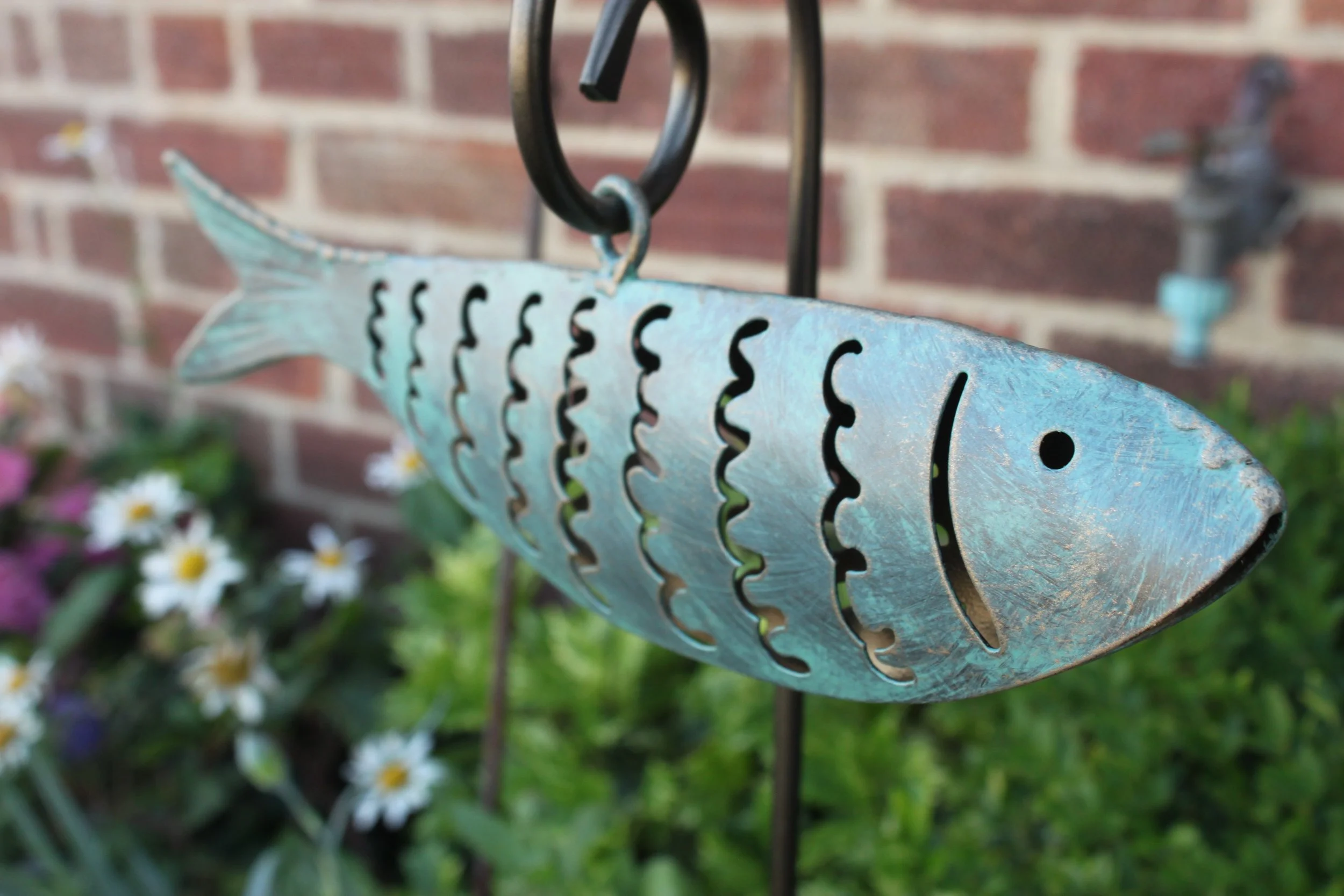This dynamic Swimming single Fish is full of movement, hanging freely from a scroll stem so that it ripples in the wind. A perfect feature near a pond, or set against long grasses or borders which catch the breeze.